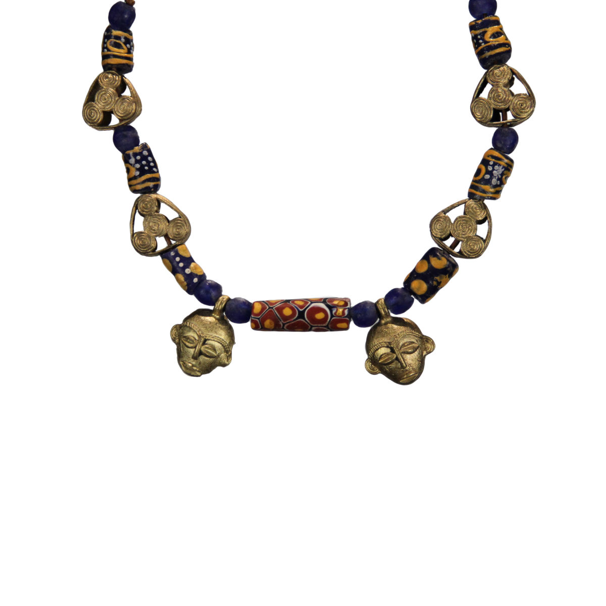 Pendant with handmade bronze amulet, bronze beads, a millefiori bead and African glass beads on a leather cord.